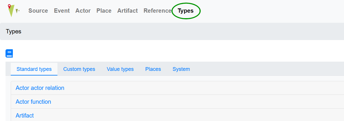 An overview of the types already created can be accessed by clicking the Types menu item. Furthermore, new types can be created here if necessary.