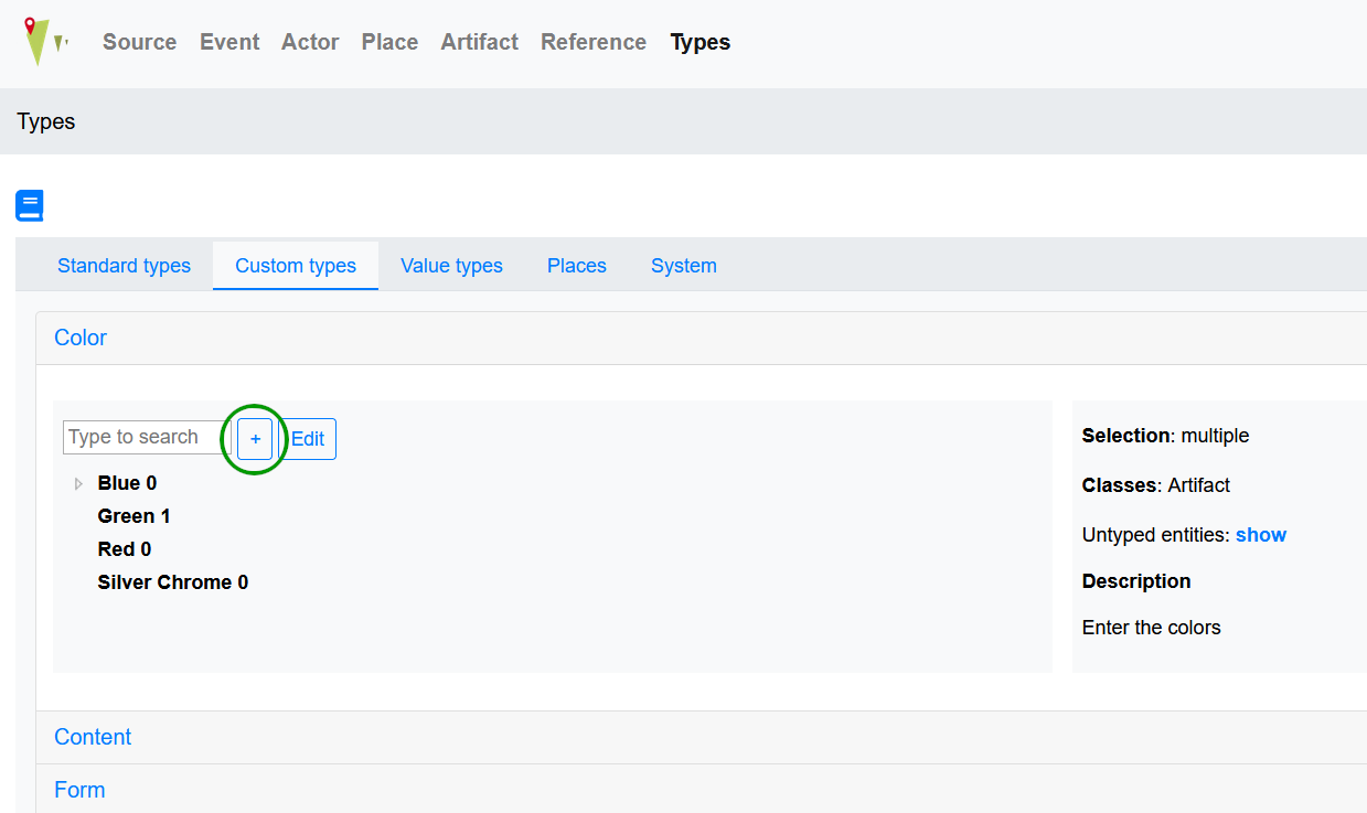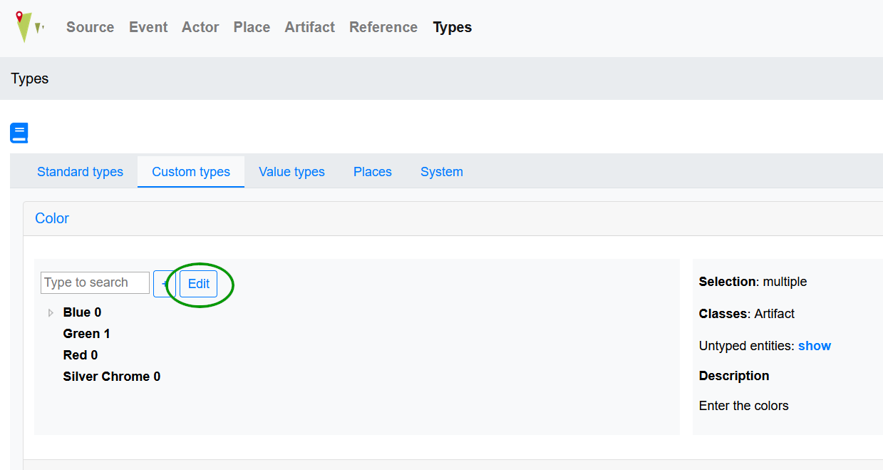 • Custom types - These types help to customize each instance of OpenAtlas; they can be created, edited, renamed, and deleted by each project to cover as much information on their data as possible; only few types come pre-installed as examples